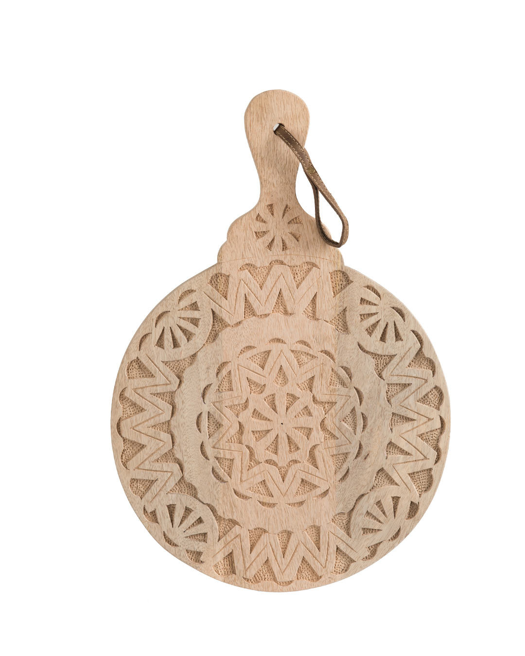 لوح تقديم دائري مستوحى من الزخارف التقليدية، يجمع بين دفء الخشب الطبيعي ودقة النقش اليدوي. بفضل تصميمه الفريد بمقبض علوي وسلك جلدي للتعليق، يتحول بسهولة من قطعة عملية إلى عنصر ديكور يلفت الأنظار.