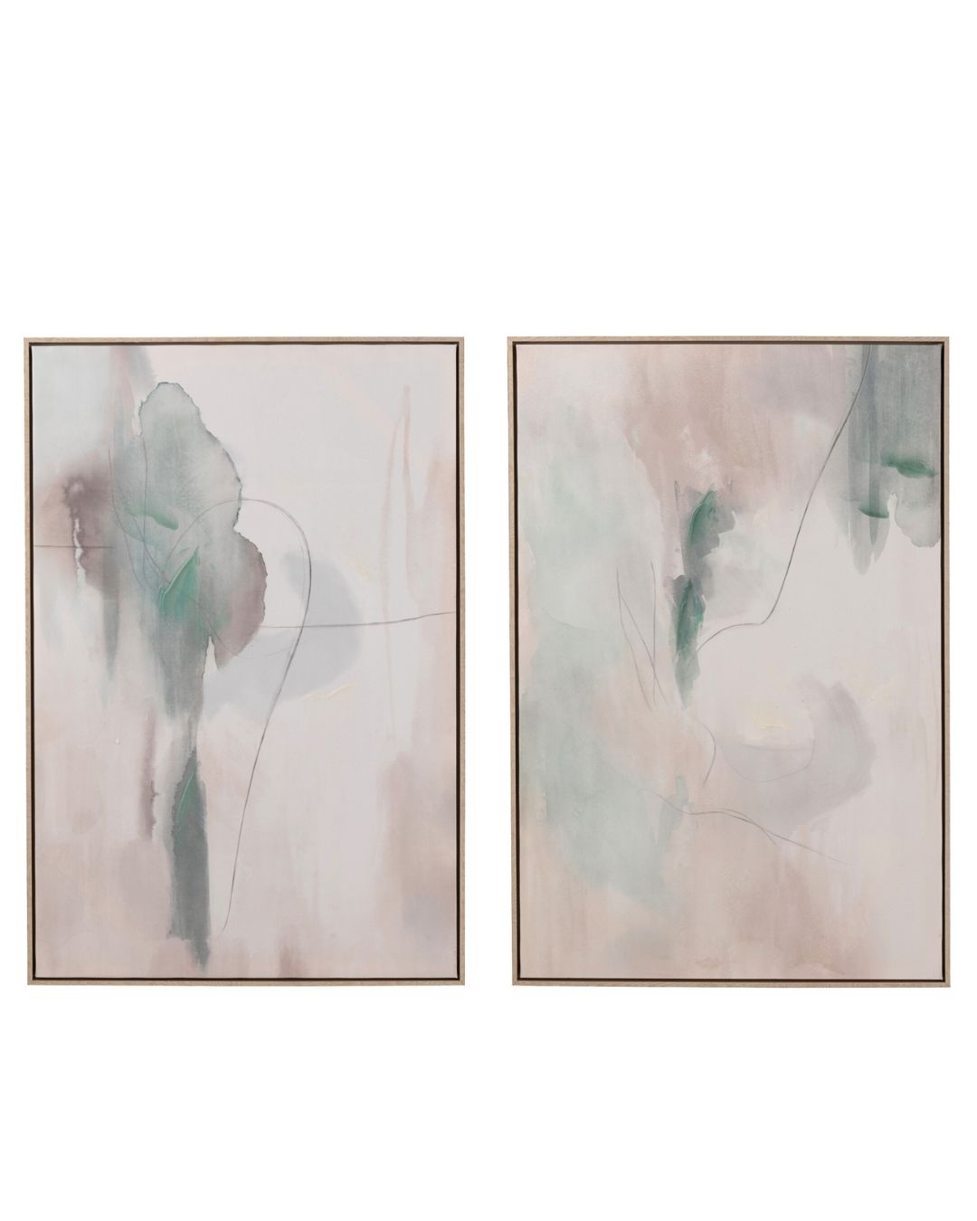 تناغم فني راقٍ يجمع بين اللمسات الناعمة والدرجات المائية الهادئة في تدرجات الأخضر والرمادي والبيج. يتميز هذا الطقم بلمسة فنية رقيقة تعكس الهدوء والتأمل، فيما يضيف الإطار الخشبي البسيط لمسة من الدفء الطبيعي تكمّل جمال التكوين.