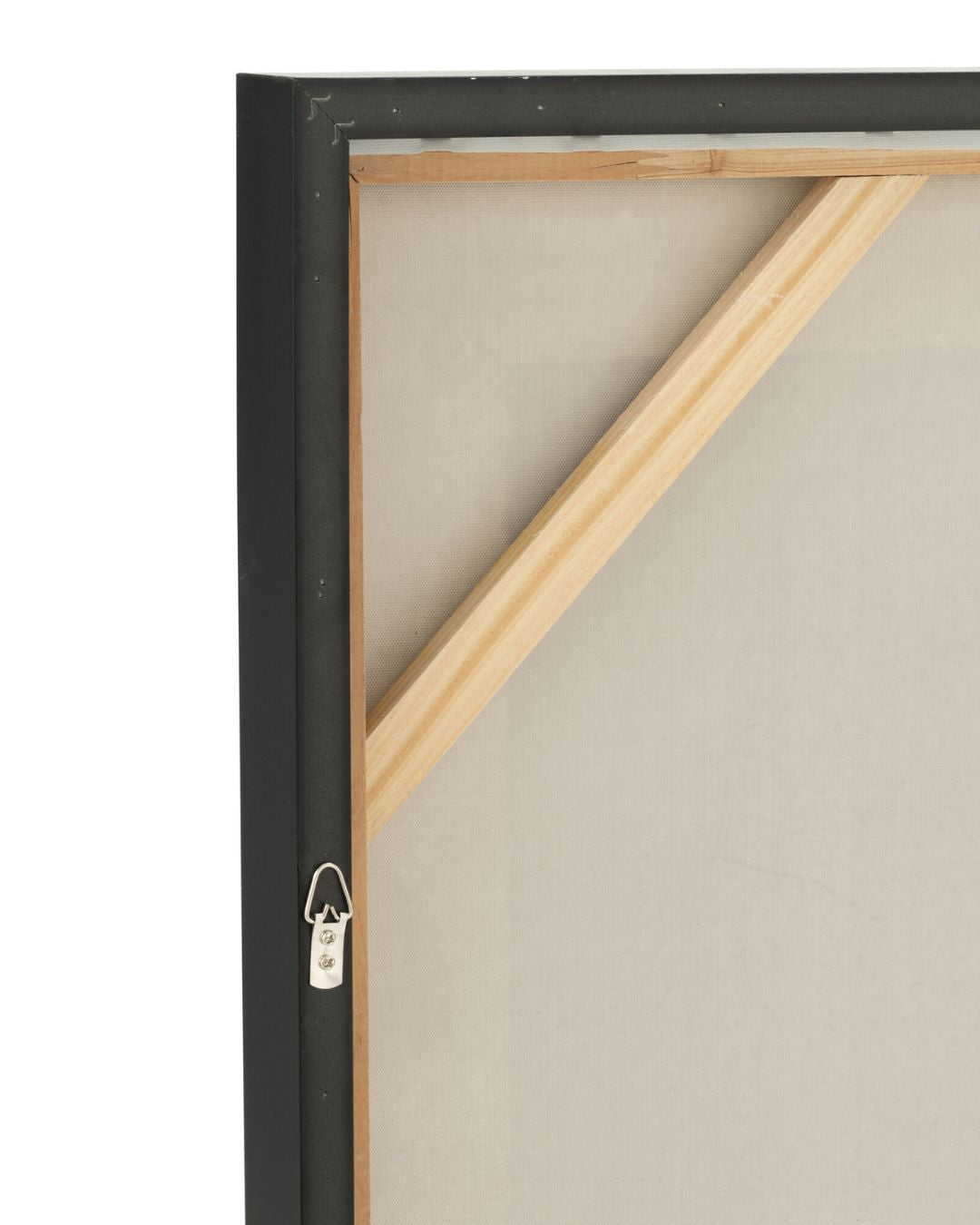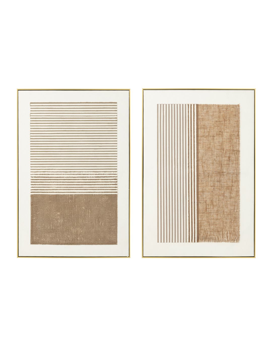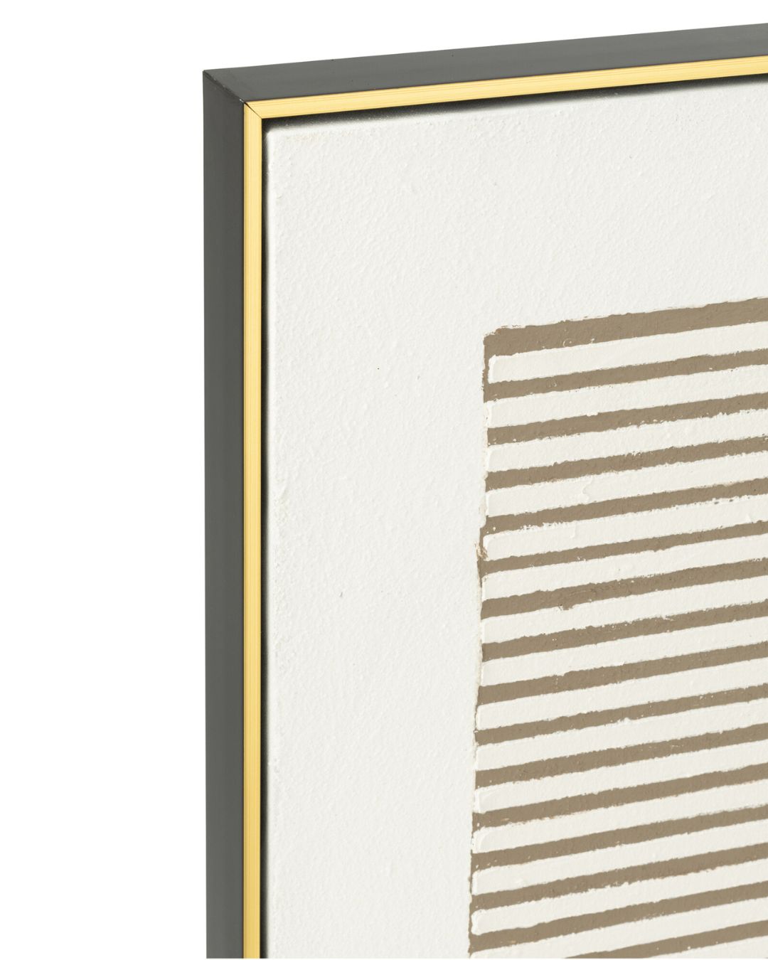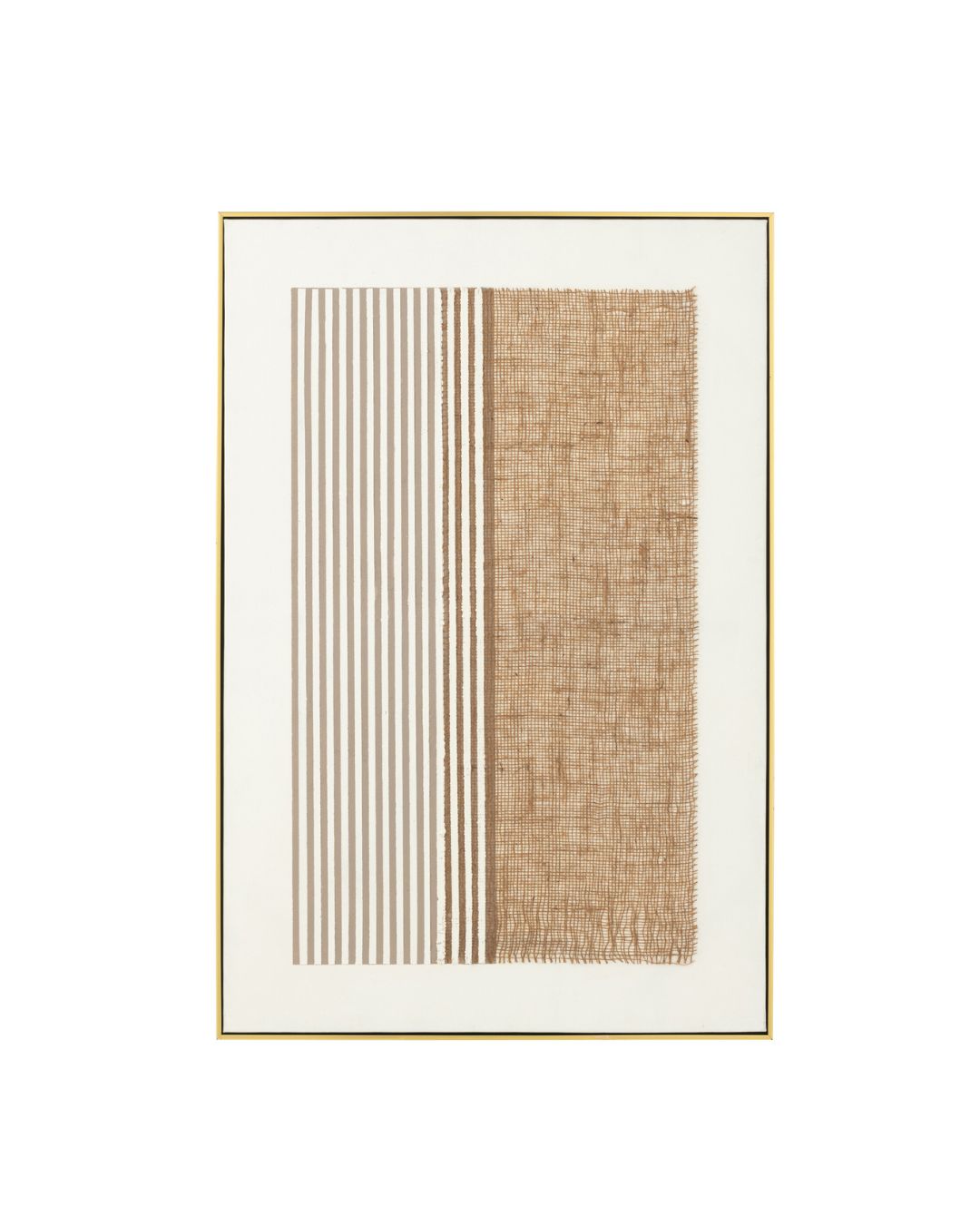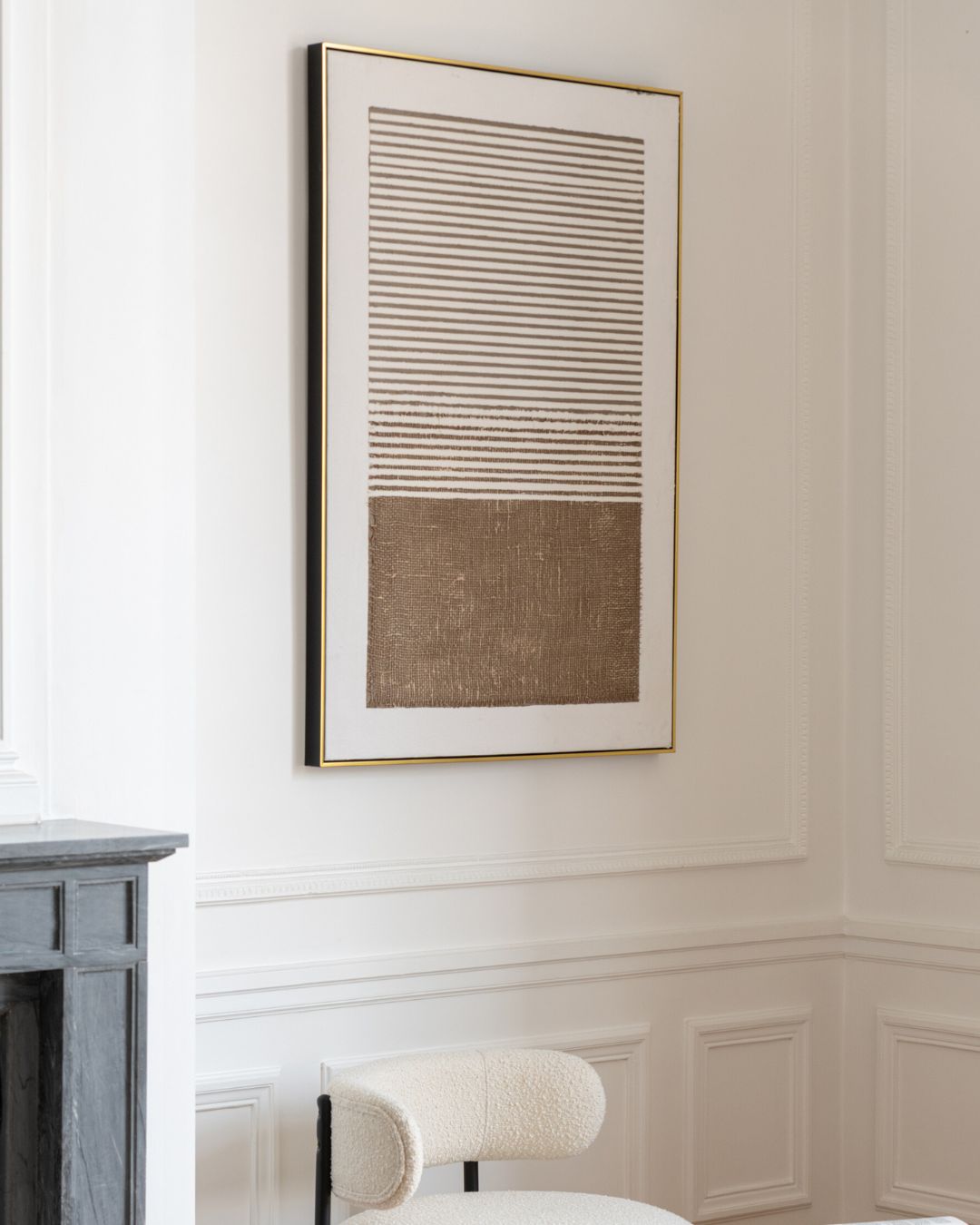 تصميم فني بسيط وأنيق يجمع بين الخطوط الهندسية المنتظمة والملمس الكتاني الطبيعي ليمنح الجدار مظهرًا متوازنًا يجمع بين الدفء والحداثة. الألوان الترابية المتناغمة والإطار الخشبي بلمسة ذهبية ناعمة تضيفان إحساسًا بالفخامة الهادئة والمينيمالية الراقية.