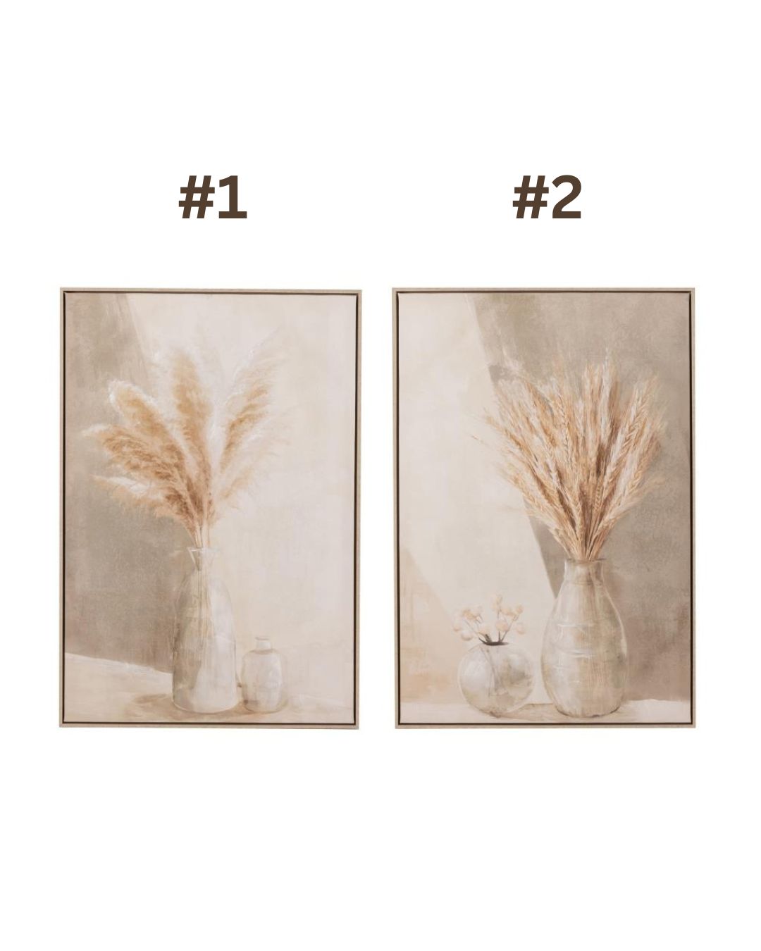 تتجسد اللمسة الفنية الراقية في هذه اللوحة الكانفس التي تجمع بين ألوان البيج الدافئة وتدرجات الكريمي الناعمة، حيث تبرز تفاصيل نبات البامباس الجاف داخل مزهريات خزفية مستوحاة من أجواء الطبيعة. ينعكس الضوء بخفة على سطح اللوحة ليمنحكِ عمقاً بصرياً ويُضفي إحساساً بالسكينة والاتساع على الجدران.
