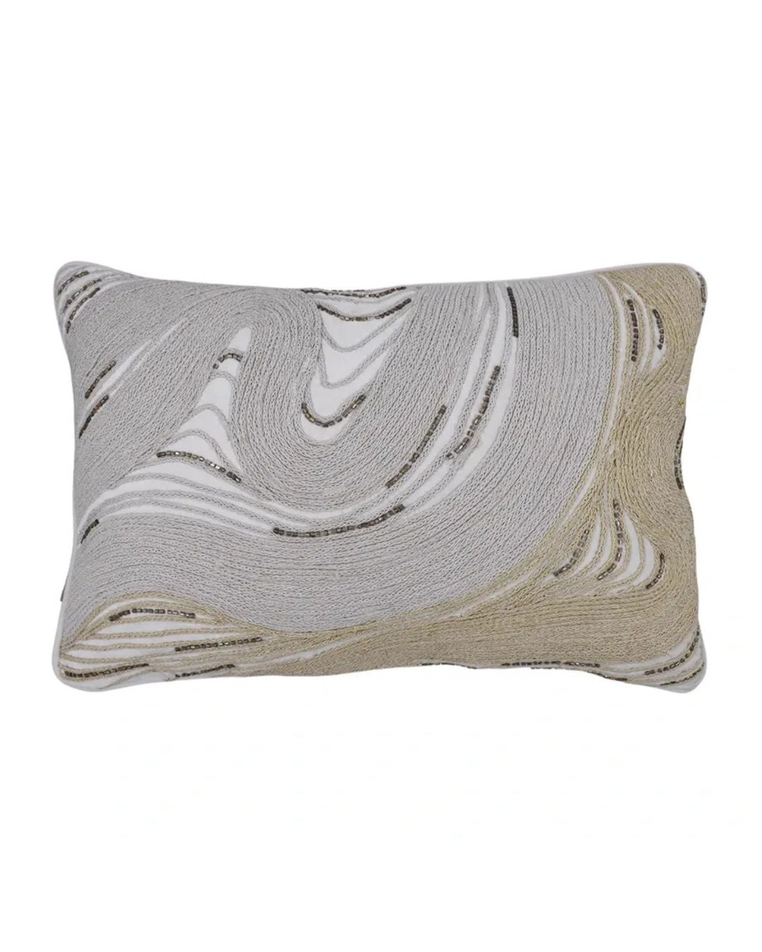 قطعة فنية راقية تتخطّى حدود الوسادة التقليدية، حيث يجتمع التصميم الانسيابي مع الفخامة الهادئة في وسادة تُجسّد الذوق الرفيع. تعكس الخطوط المنحنية المطرّزة بعناية بالغة ملامح حركة سائلة مستوحاة من الطبيعة، ما يضفي على القطعة طابعًا عضويًا يبعث على الراحة والانسجام البصري.