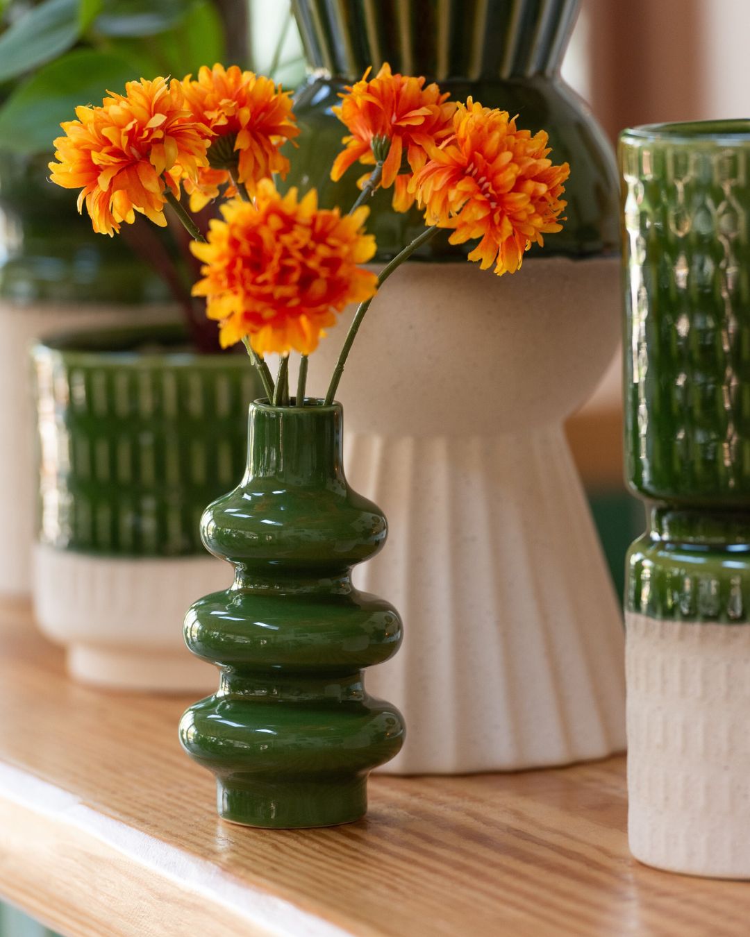 تأتي بلونين متناسقين — الأبيض الهادئ والأخضر الزيتي اللامع — لتمنحك حرية الاختيار في تنسيقها حسب طابع المساحة. مثالية للطاولات الجانبية أو الرفوف أو المكاتب، وتضفي لمسة من الرقي والهدوء في كل زاوية.