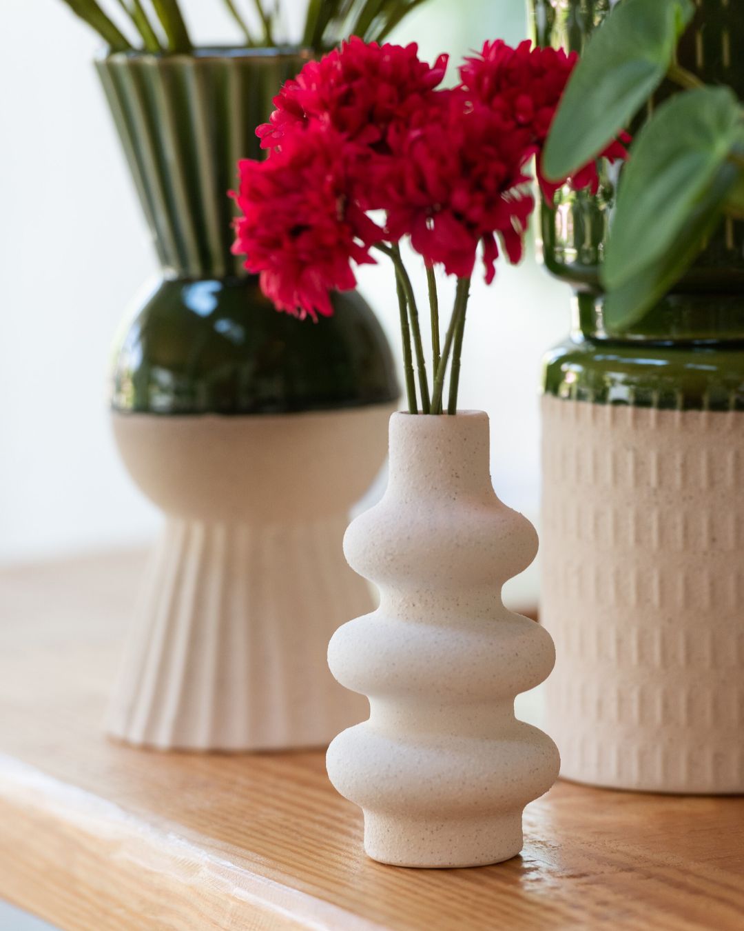 أبرزي ذوقك الرفيع مع هذه المزهرية المصنوعة من البورسلان الفاخر بتصميمها المتموّج اللافت الذي يعكس توازن الفن والبساطة. تجمع بين اللمسات الحديثة والأناقة الكلاسيكية لتصبح قطعة ديكورية تلفت الأنظار حتى دون أزهار.