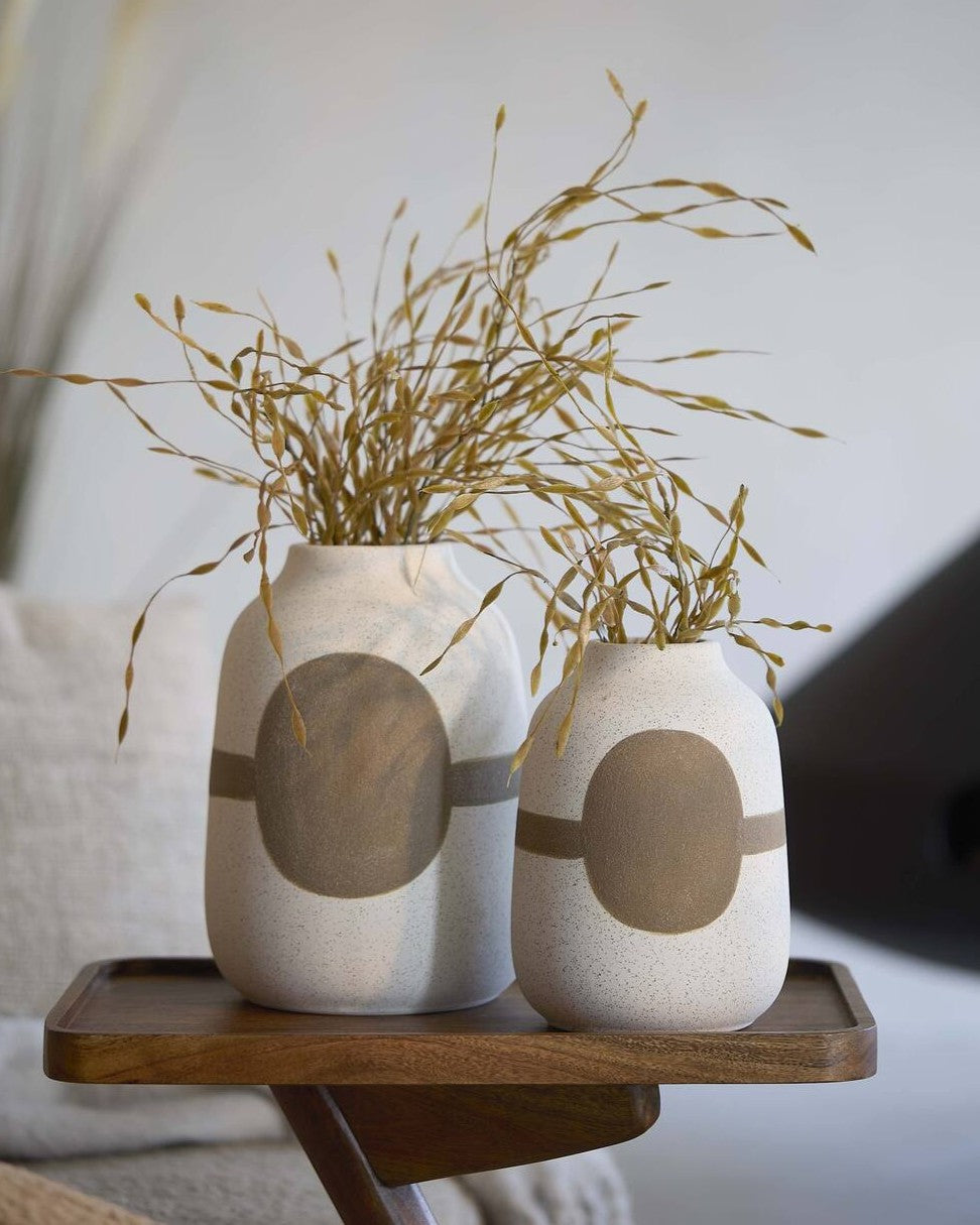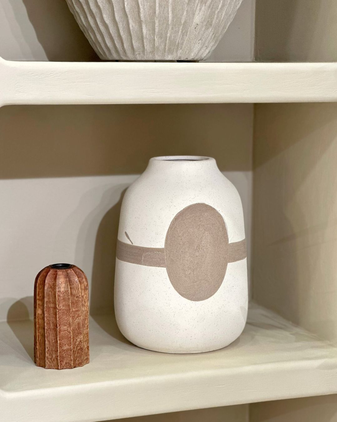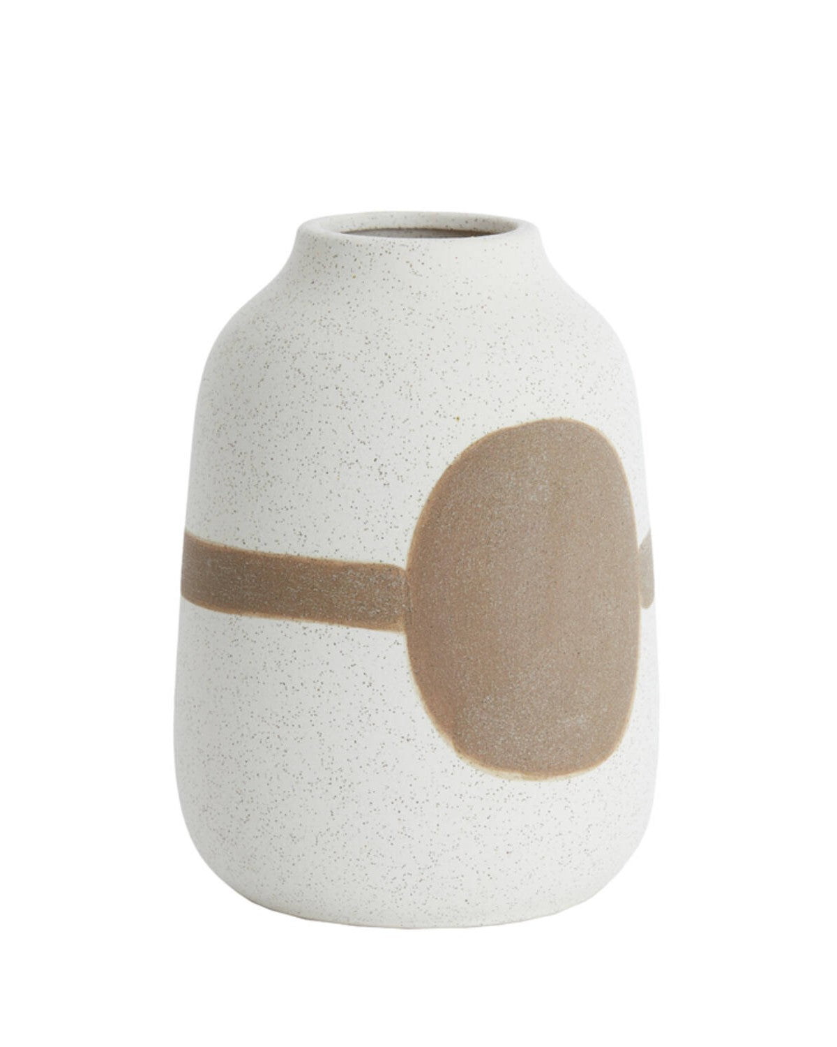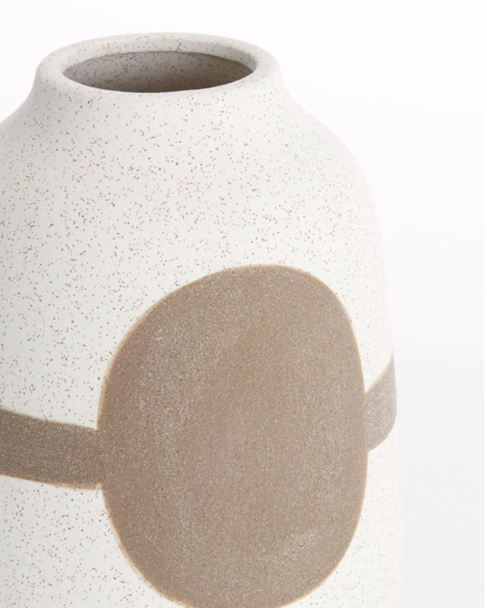 مزهرية تجمع بين الحداثة والبساطة، إذ يتجلّى فيها حضور الفن التجريدي من خلال دائرة بنية أنيقة تحيطها خطوط بسيطة على أرضية بيضاء مرقطة. يبرز التصميم بشكل متوازن وهادئ، ويضفي لمسة معاصرة ودافئة على أي ركن في منزلكِ، مع ملمس خشن يمنحها طابعًا طبيعيًا أصيلًا وإحساسًا بالفخامة اليدوية.