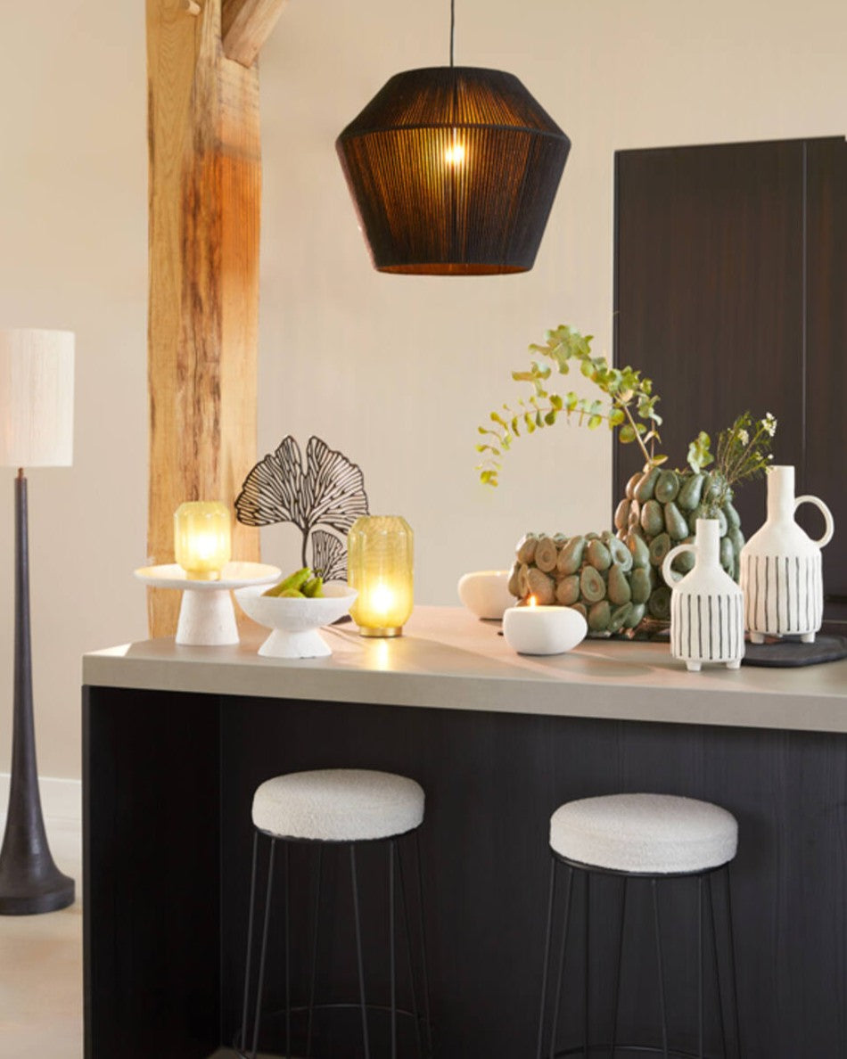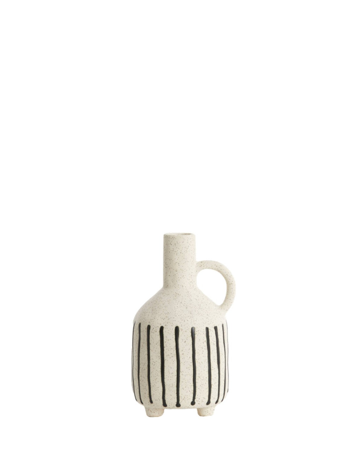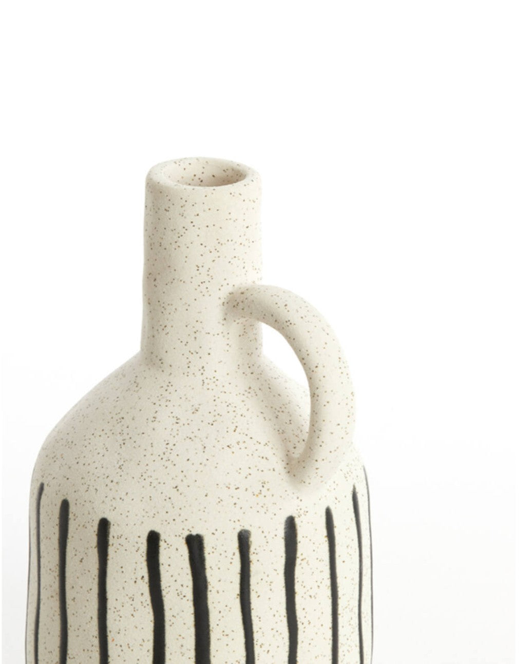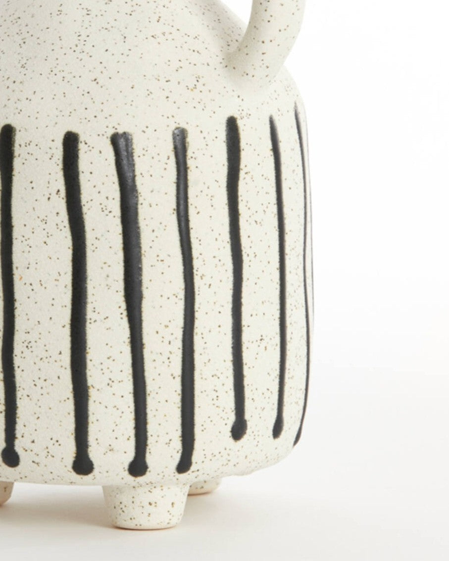 مزهرية تجمع بين الطابع اليدوي وروح التصميم العصري، حيث تبرز الخطوط السوداء البارزة على خلفية بيضاء مرقطة، لتضفي حضورًا بصريًا ملفتًا ولمسة فنية فريدة في أي ركن من أركان منزلكِ. ملمسها الخشن يضفي عليها طابعًا أصيلًا ويمنحكِ إحساسًا بجمال الحرف اليدوية والدفء الطبيعي.