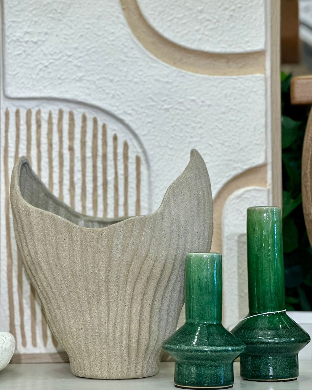 تجسد هذه المزهرية روعة التفاصيل المستوحاة من الطبيعة، حيث تبدو وكأنها منحوتة يدوية تحاكي تموّجات الرمال أو حركة أوراق النباتات. لونها الحجري وملمسها غير اللامع يمنحانها حضوراً هادئاً وفاخراً يليق بأحدث صيحات الديكور.
