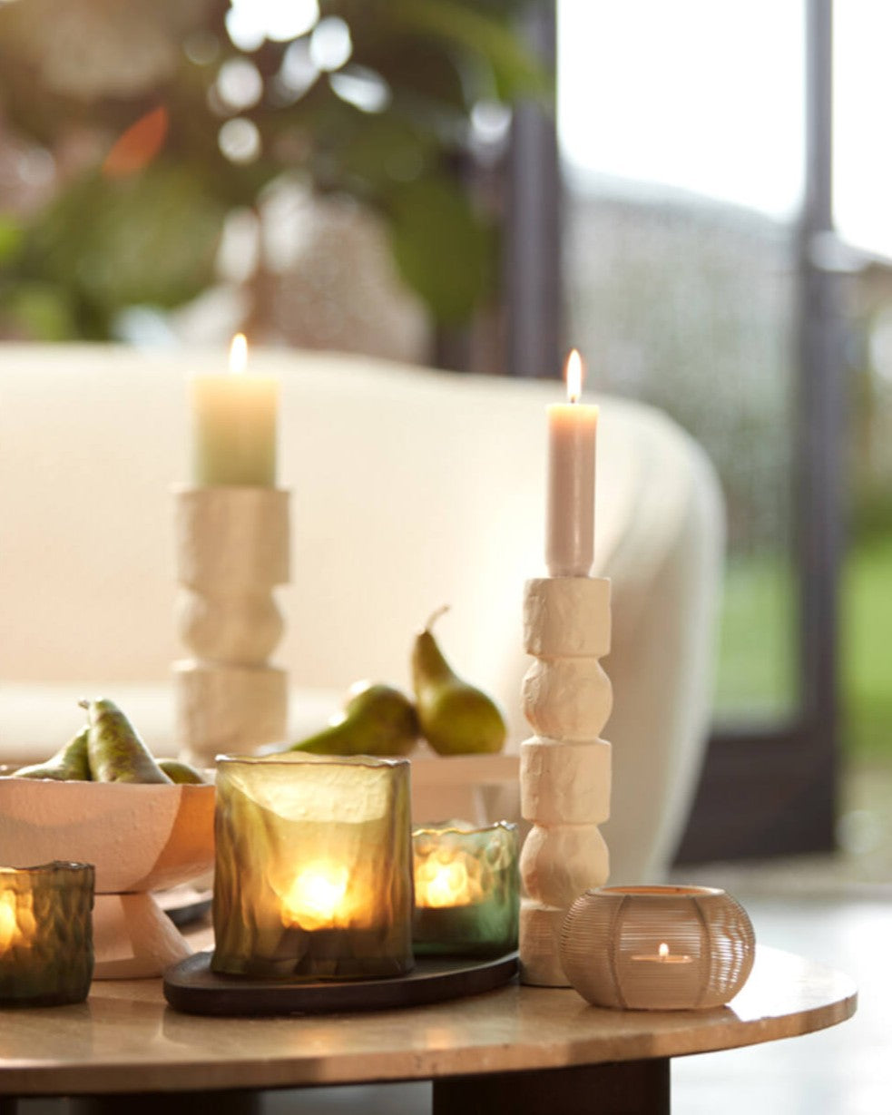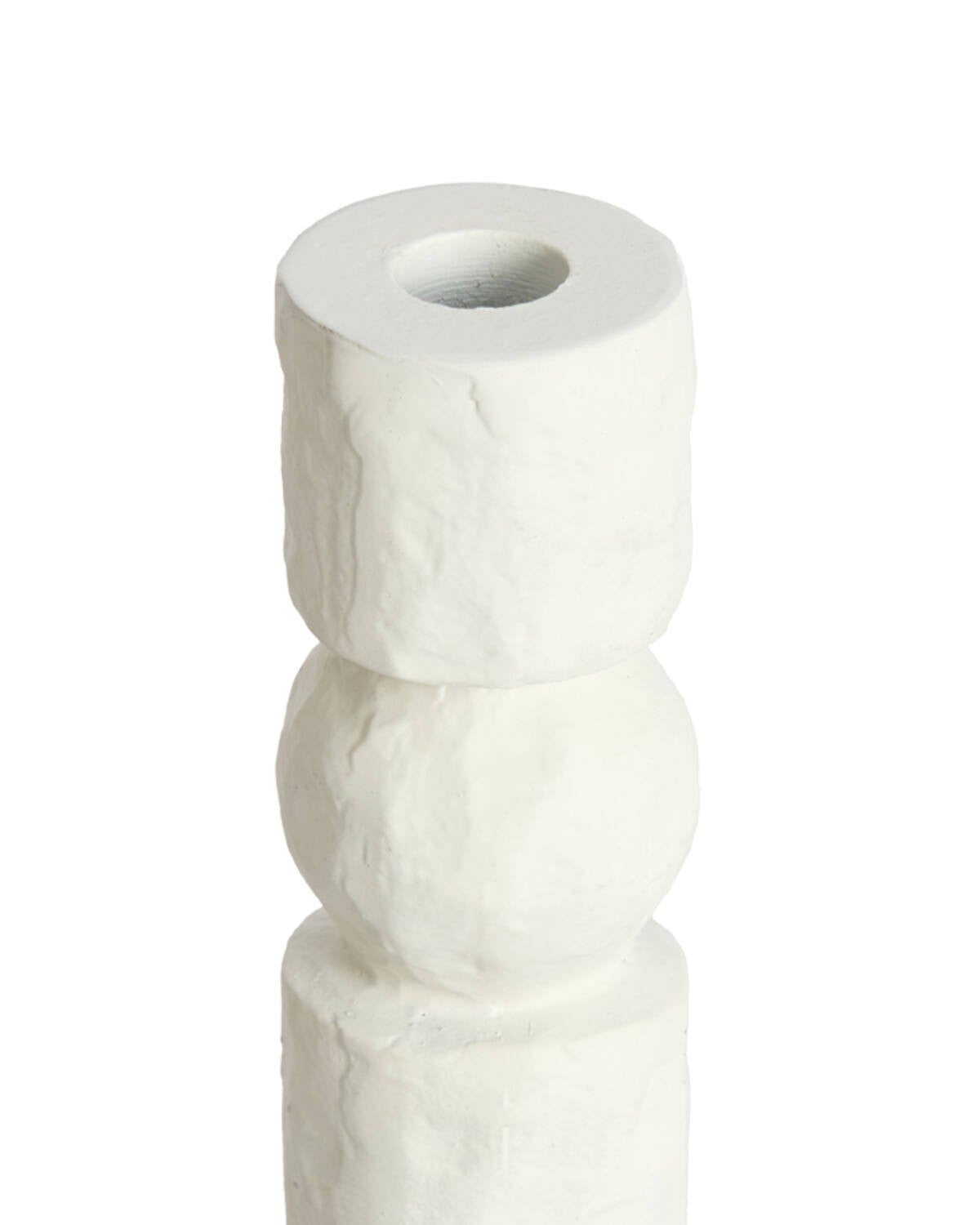 يتميز الشمعدان بسطحه غير المنتظم الذي يضفي عليه طابعًا فنيًا يدويًا، فيما تمنحه الأبعاد الطويلة حضورًا بارزًا على الطاولات الجانبية أو رفوف الاستقبال. يعكس اللون الأبيض الضوء بطريقة ساحرة، ليحول أمسياتك إلى لحظات تنبض بالهدوء والنقاء.