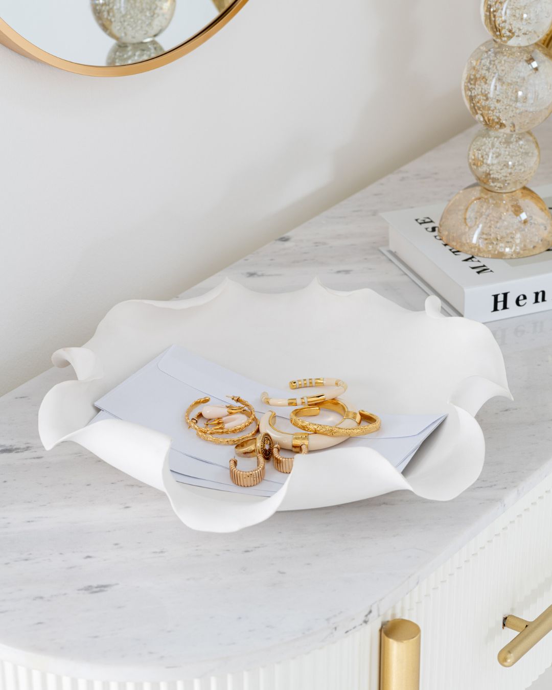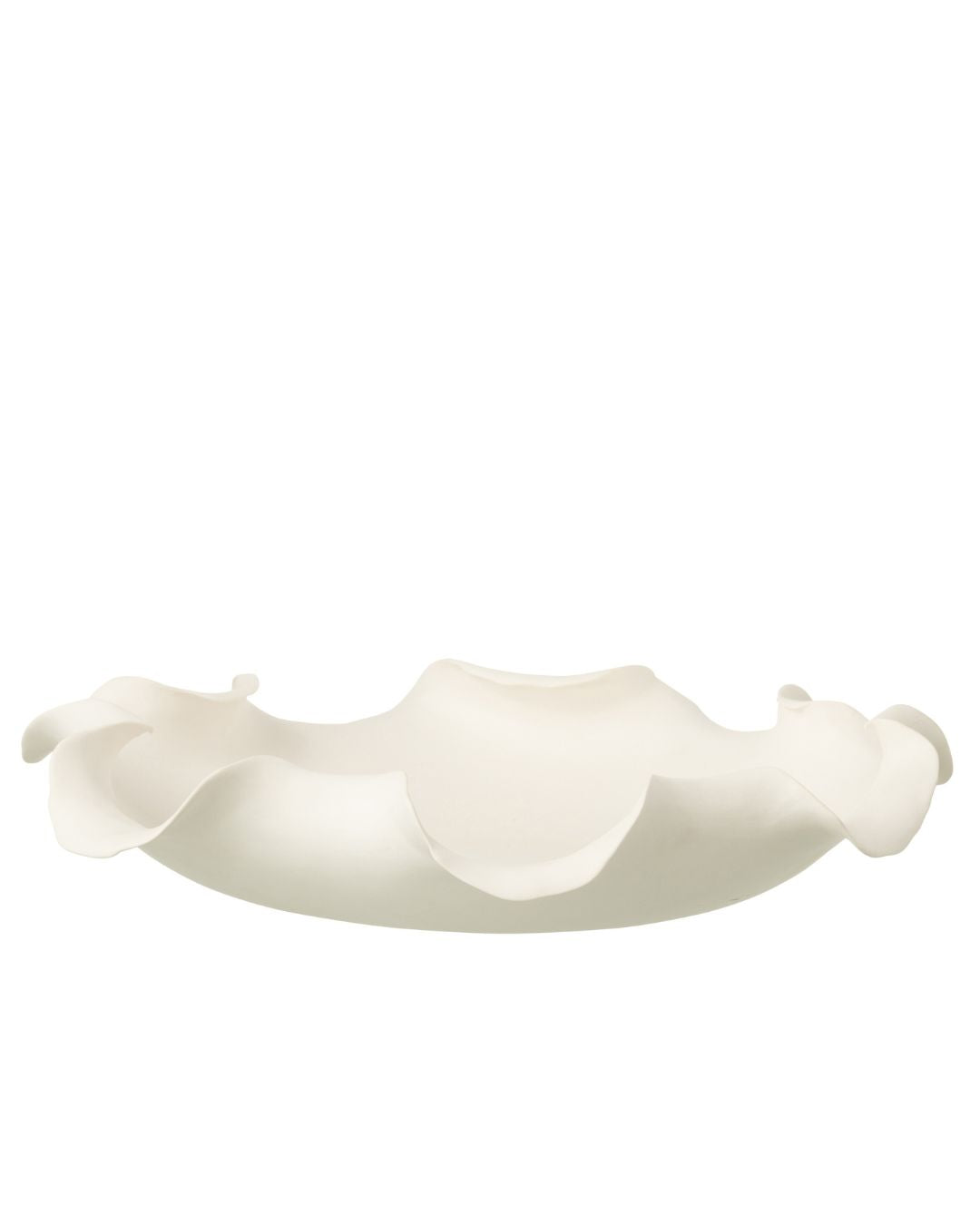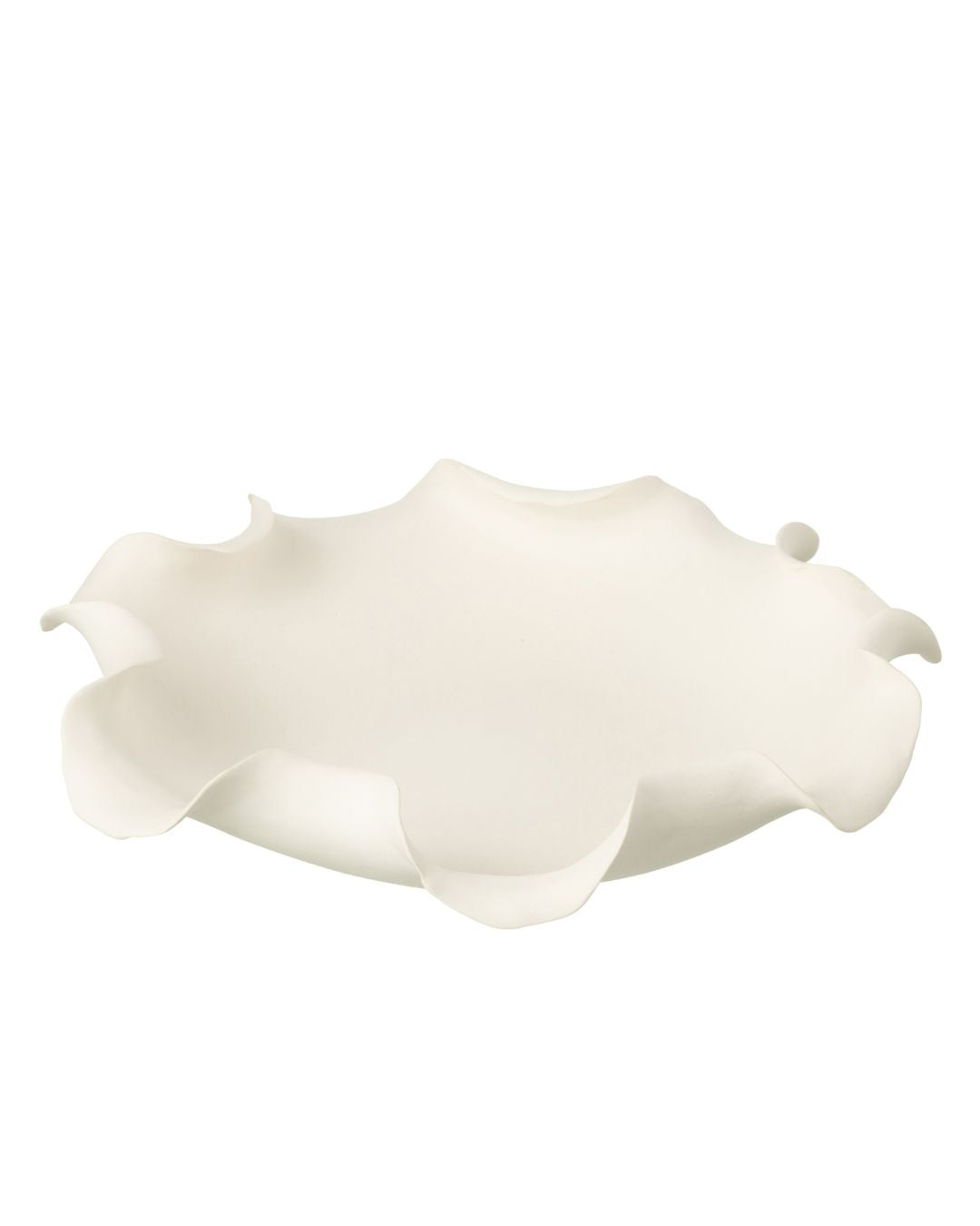 تحفة فنية تجسّد الانسيابية والبساطة في آنٍ واحد، بتصميم يشبه حركة الموج أو تفتح الزهرة البيضاء. الحواف المتموجة تضفي لمسة ناعمة من الحركة والرشاقة، فيما يبرز اللون الأبيض المطفأ نقاء التصميم وجاذبيته الهادئة.