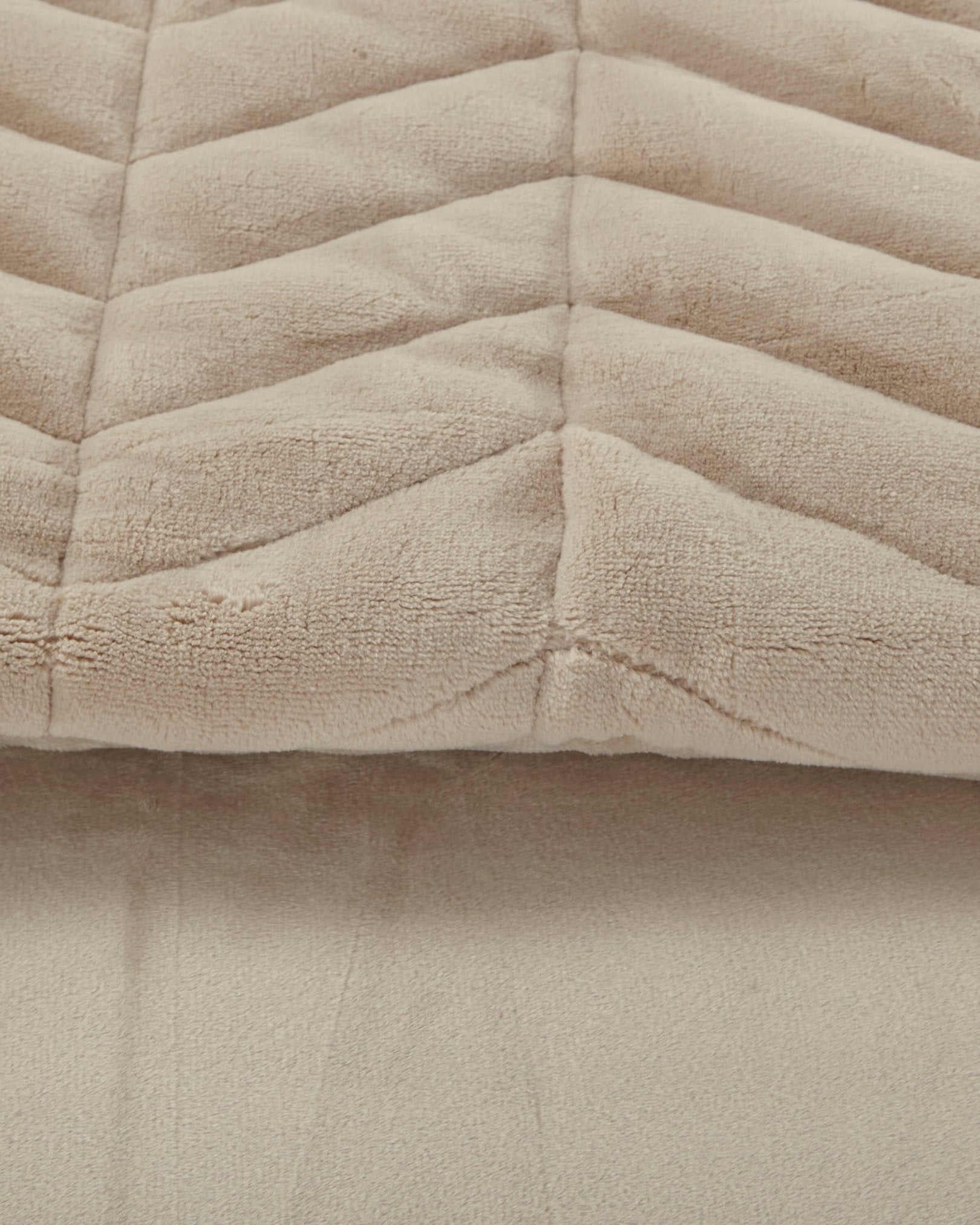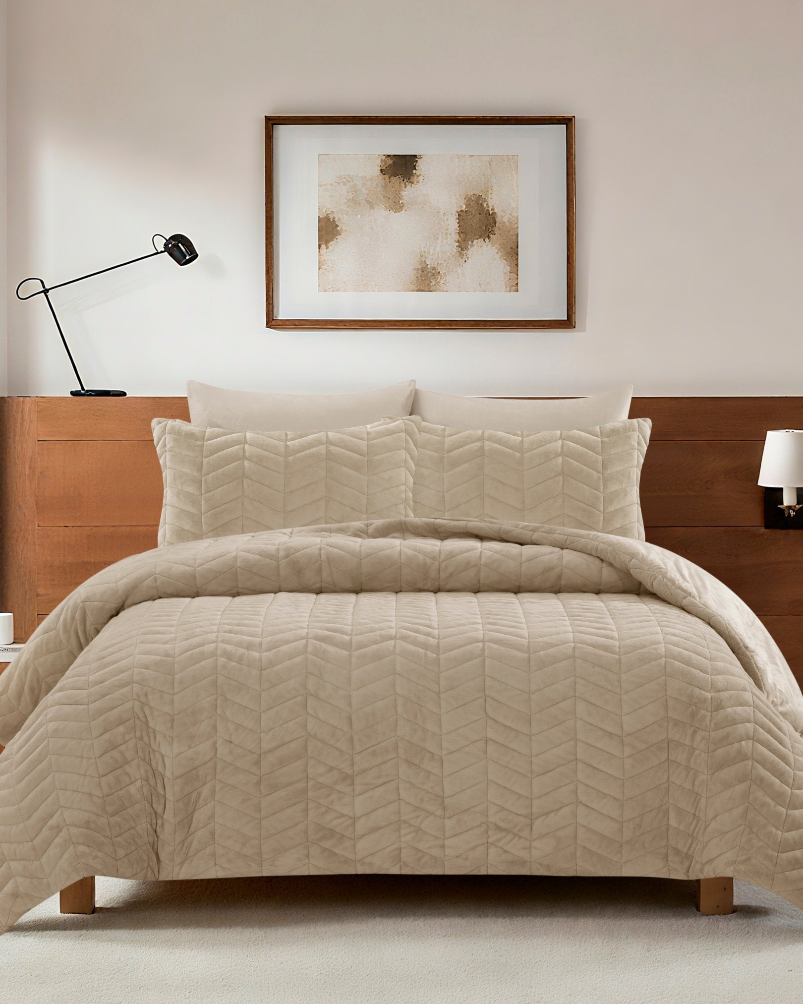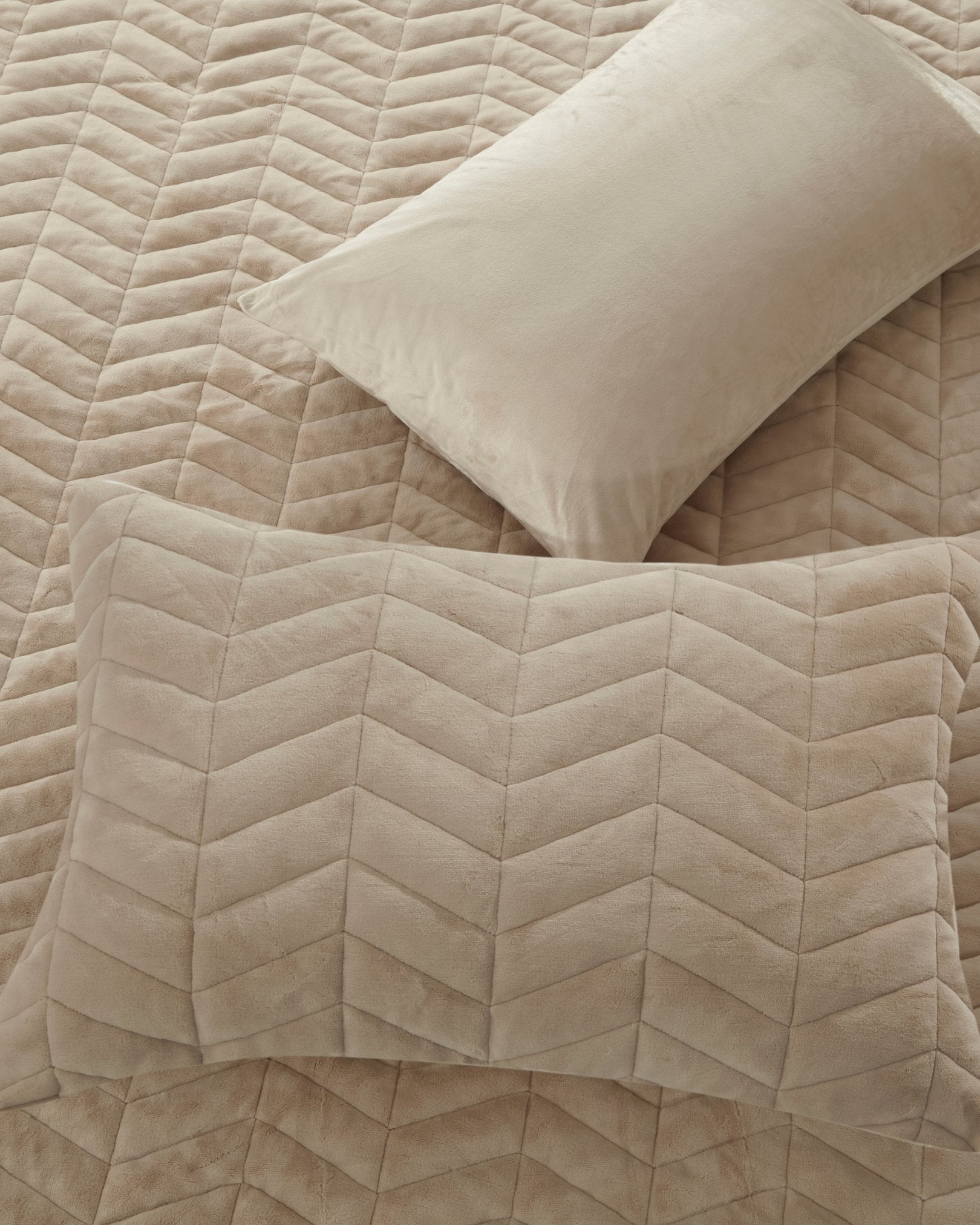 يضم الطقم لحافًا مبطّنًا بتصميم شيفرون جذاب ووسادتين بتصميم متكامل، بالإضافة إلى وسادتين إضافيتين بسطح أملس، ما يمنح السرير مظهرًا متناسقًا ومتعدد الطبقات يليق بأفخم غرف النوم. اللون البيج الهادئ يعزز من الإحساس بالنقاء والسكينة، ويُعد خيارًا مثاليًا للديكورات الراقية والمتنوعة.