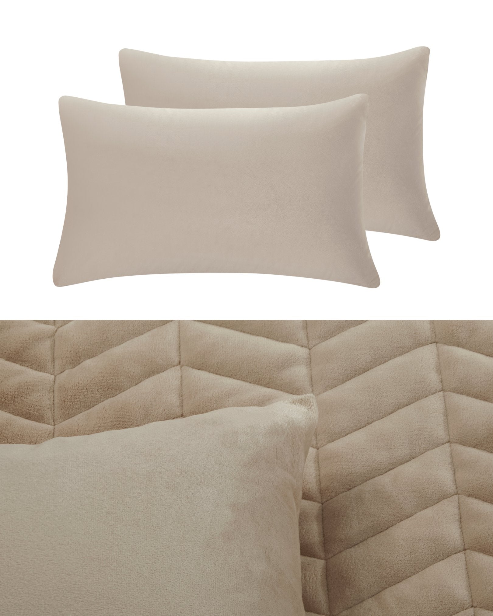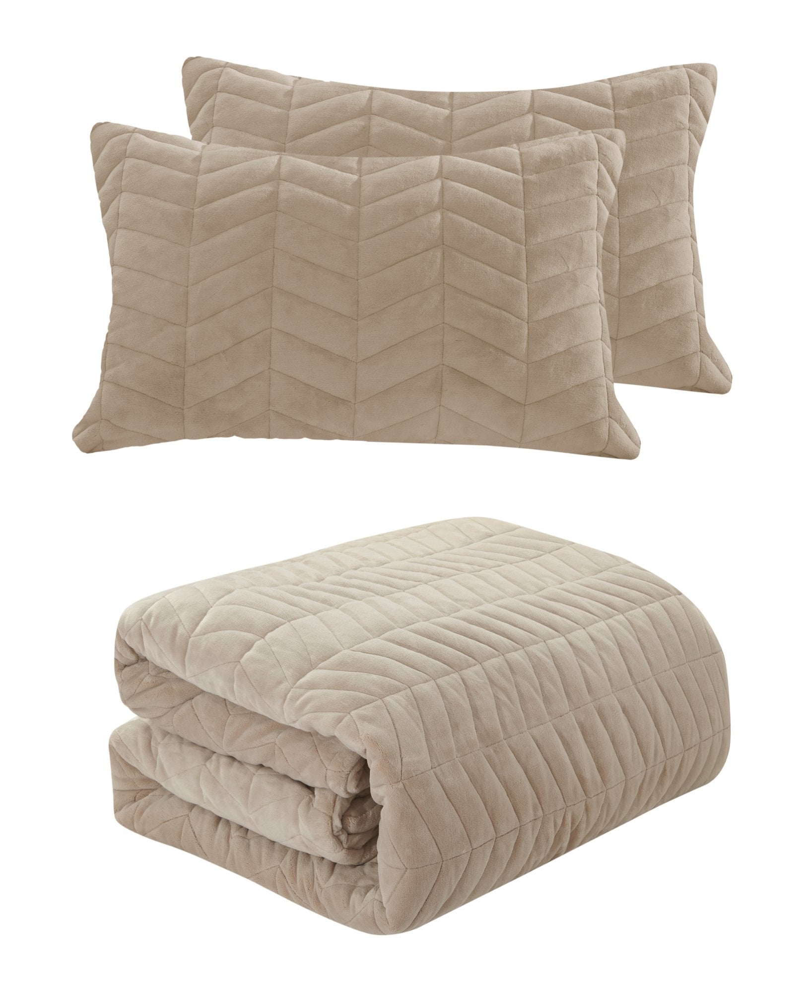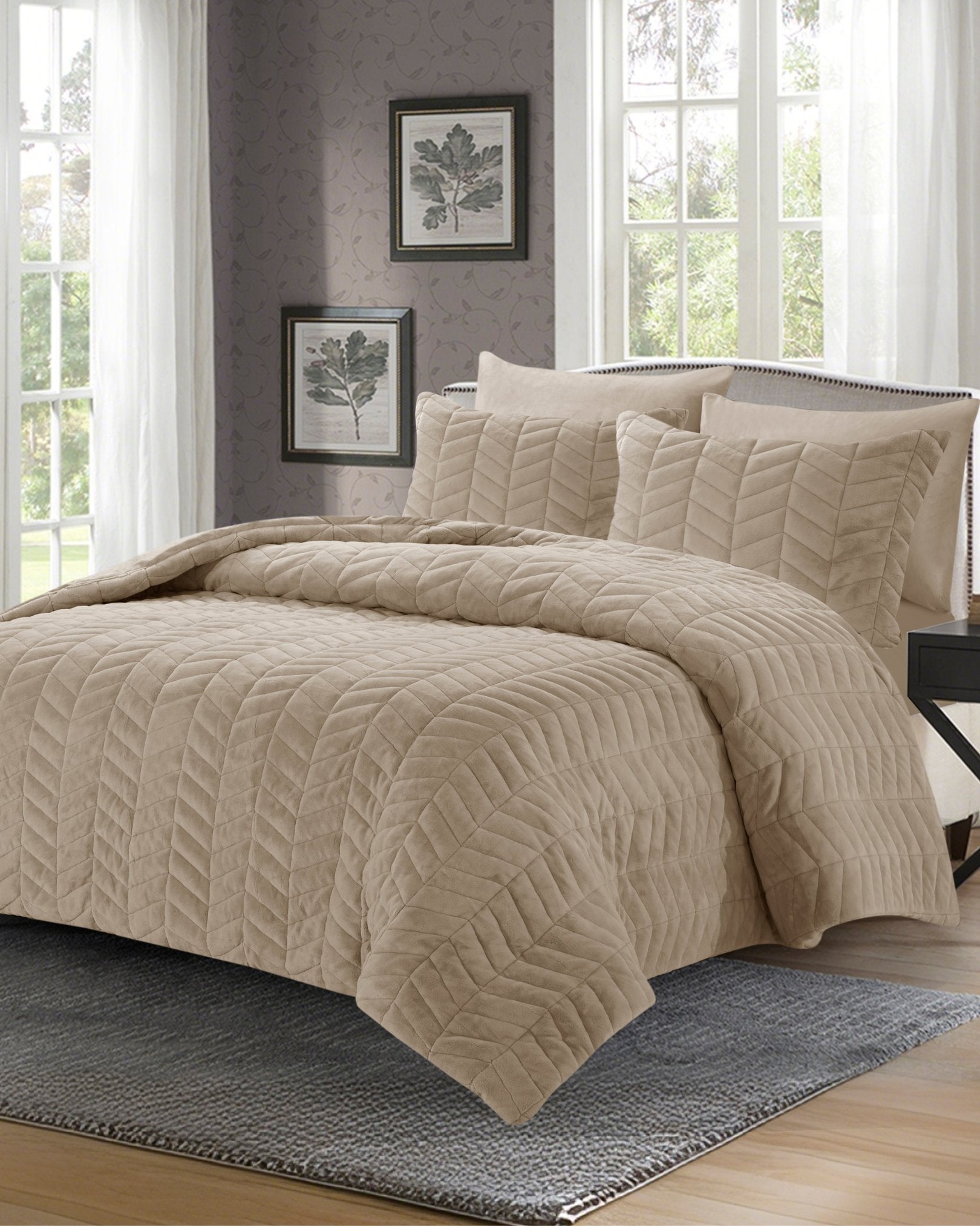 يضم الطقم لحافًا مبطّنًا بتصميم شيفرون جذاب ووسادتين بتصميم متكامل، بالإضافة إلى وسادتين إضافيتين بسطح أملس، ما يمنح السرير مظهرًا متناسقًا ومتعدد الطبقات يليق بأفخم غرف النوم. اللون البيج الهادئ يعزز من الإحساس بالنقاء والسكينة، ويُعد خيارًا مثاليًا للديكورات الراقية والمتنوعة.