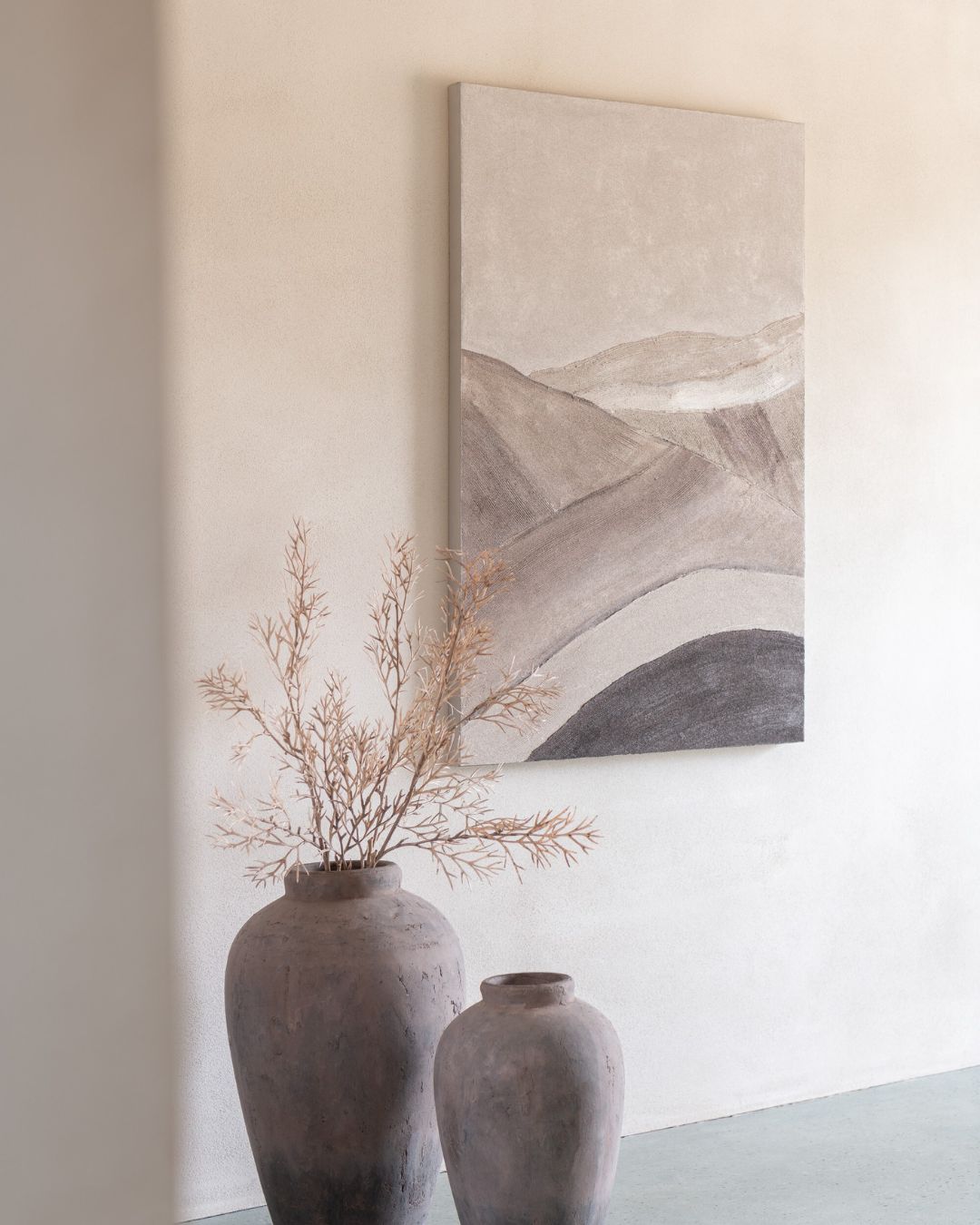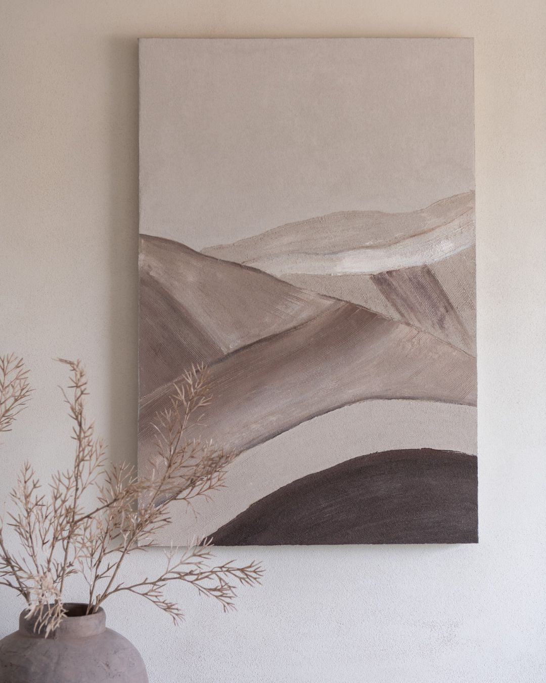 قطعة فنية تعكس بساطة المشهد الطبيعي بأسلوب تجريدي أنيق. تمزج بين درجات الألوان الدافئة، مما يخلق توازنًا بصريًا يضفي لمسة راقية وهادئة على المساحة.
