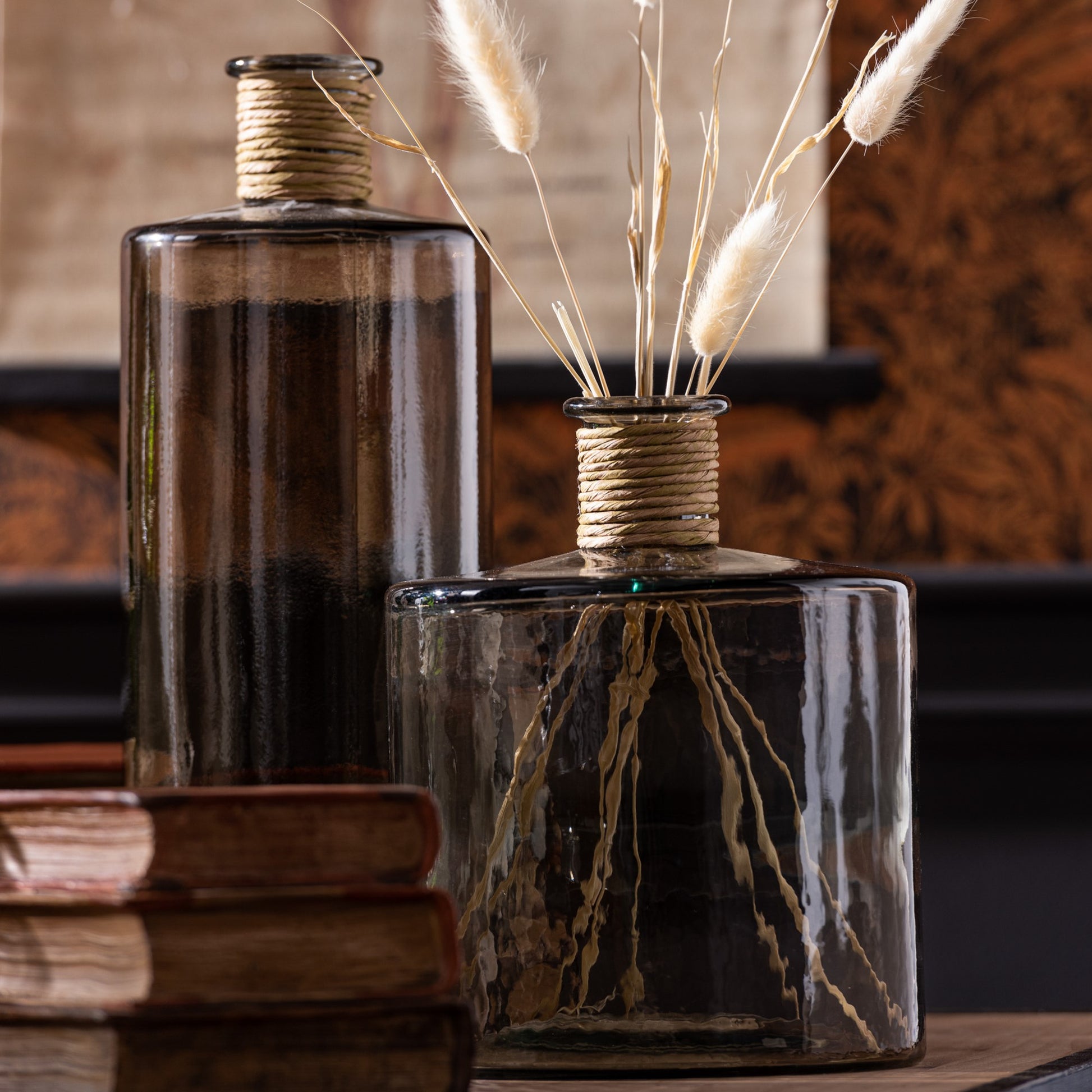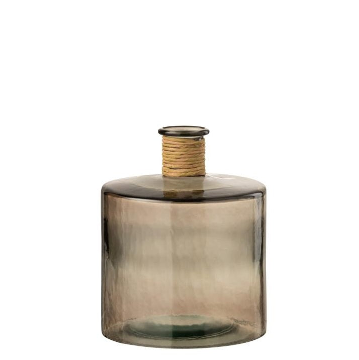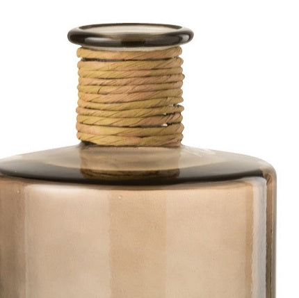 مزهرية زجاجية بتدرجات عسلية وحواف ملفوفة بالخيش